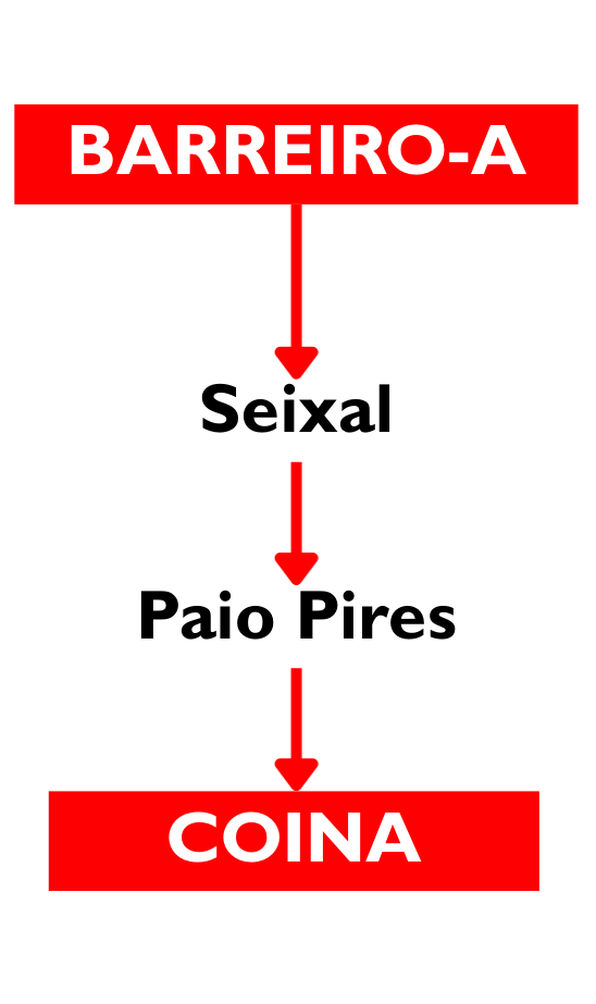 Diagrama funcional do eixo Barreiro-A – Seixal – Paio Pires – Coina, evidenciando a criação de uma ligação direta entre os principais pólos urbanos da região.