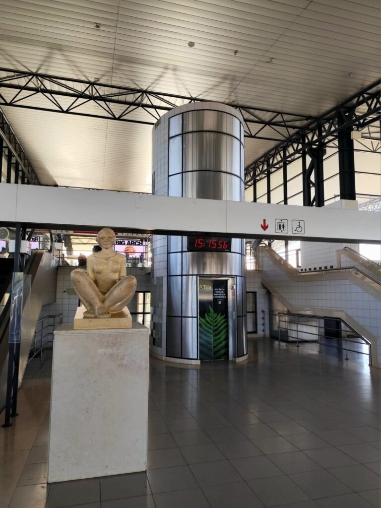 Escultura no átrio principal, afirmando a presença da arte contemporânea no quotidiano de uma estação de transportes.