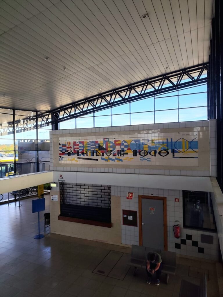 Painéis de azulejos integrados na arquitetura da estação, onde a arte de Nadir Afonso faz parte do próprio espaço de circulação ferroviária.