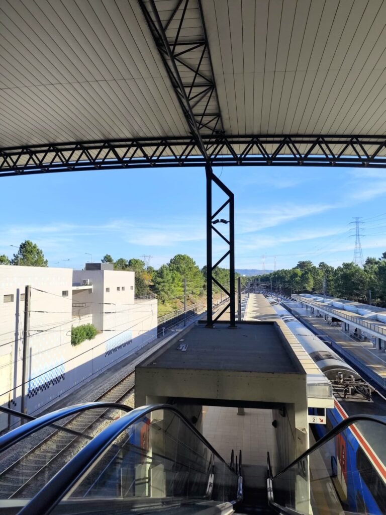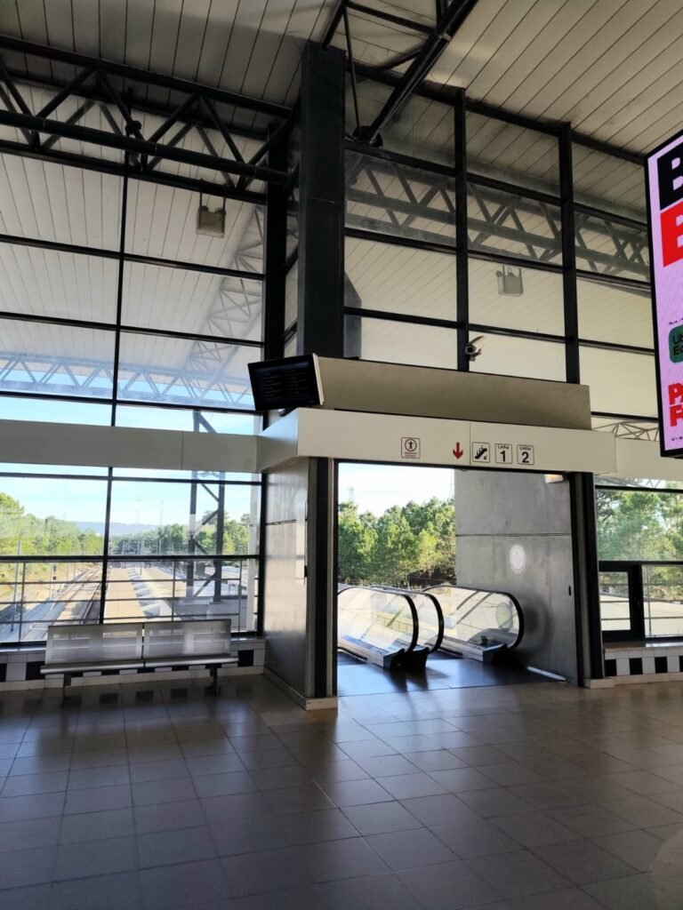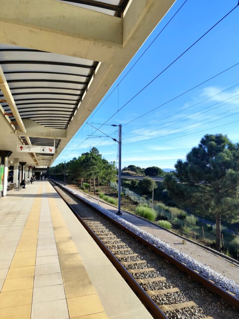 As plataformas e as vias de Coina vistas como espaço ferroviário em pleno funcionamento, onde a infraestrutura pesada, a sinalização e a arquitetura moderna se articulam para garantir a operação contínua da rede suburbana.