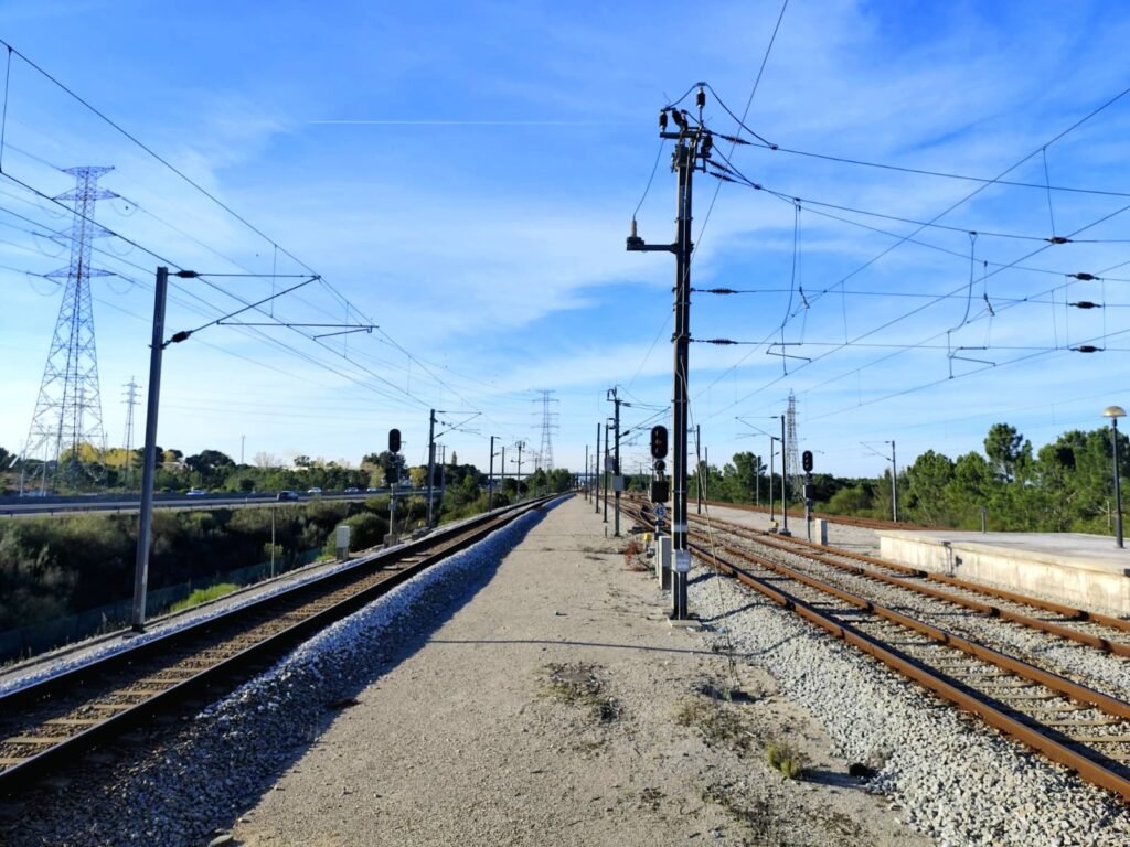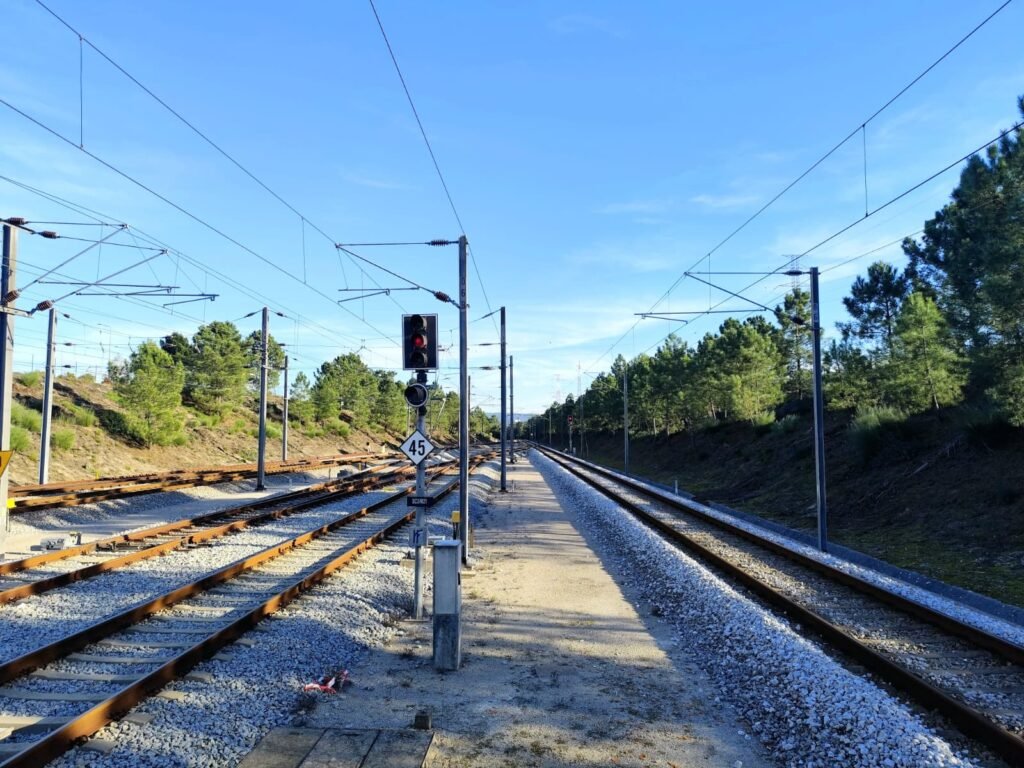 Conjunto que ilustra a infraestrutura e a operação ferroviária de Coina, onde plataformas, vias, sinalização e estruturas de acesso revelam a estação como um nó técnico essencial da rede.