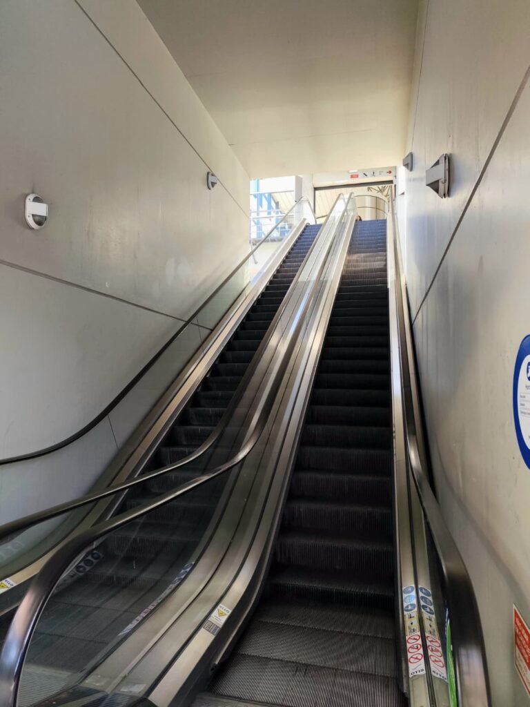 Escadas rolantes de acesso à plataforma, a partir do átrio superior da estação.