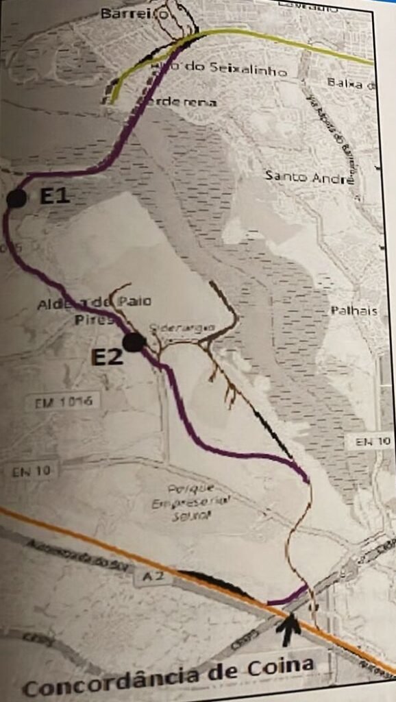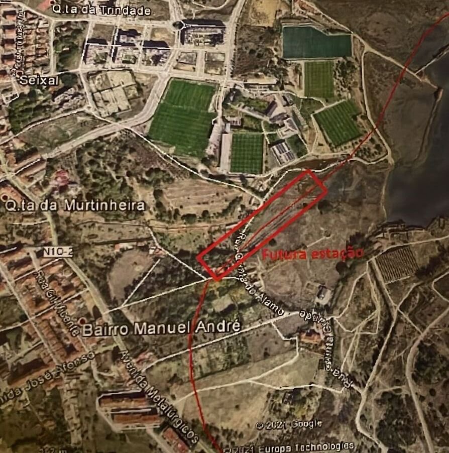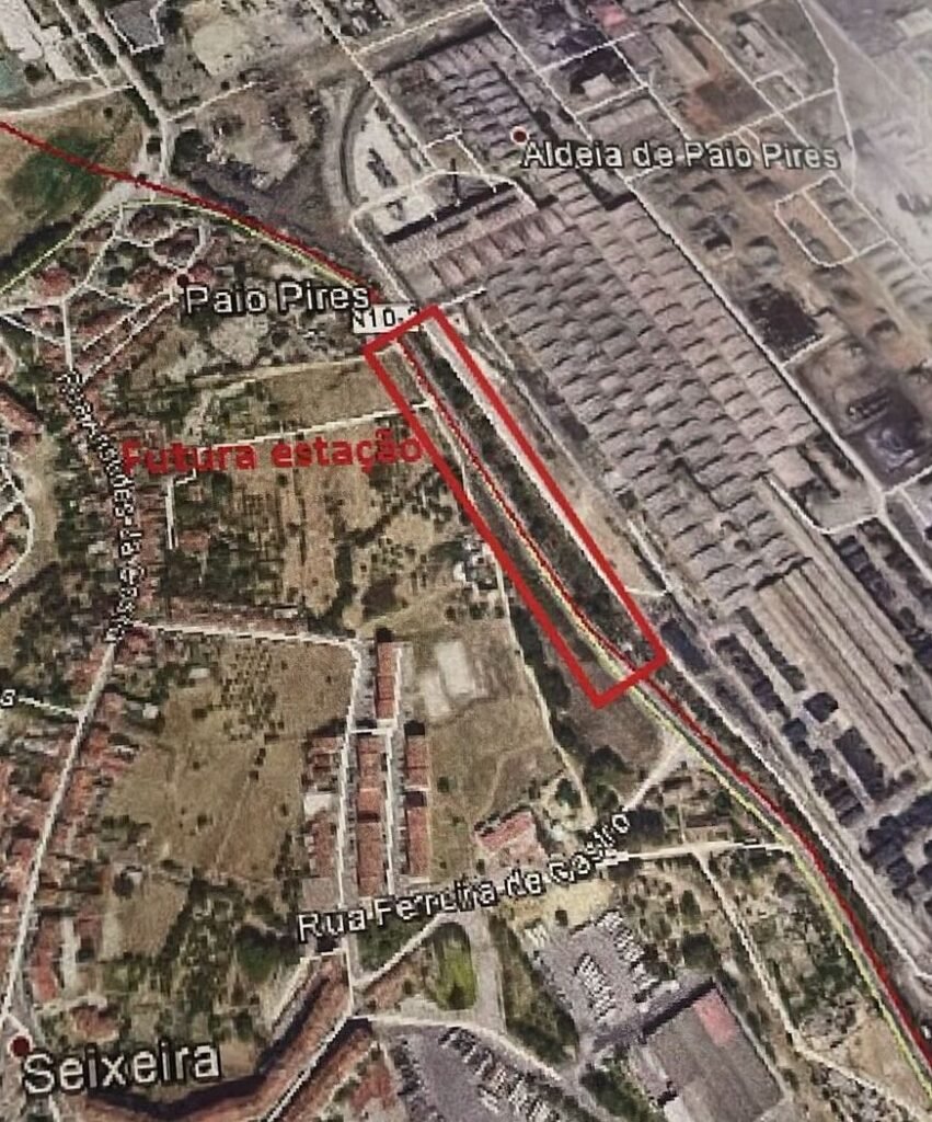 Localização prevista da futura estação de Paio Pires, pensada para servir Seixeira, Colmeias e a zona industrial envolvente.