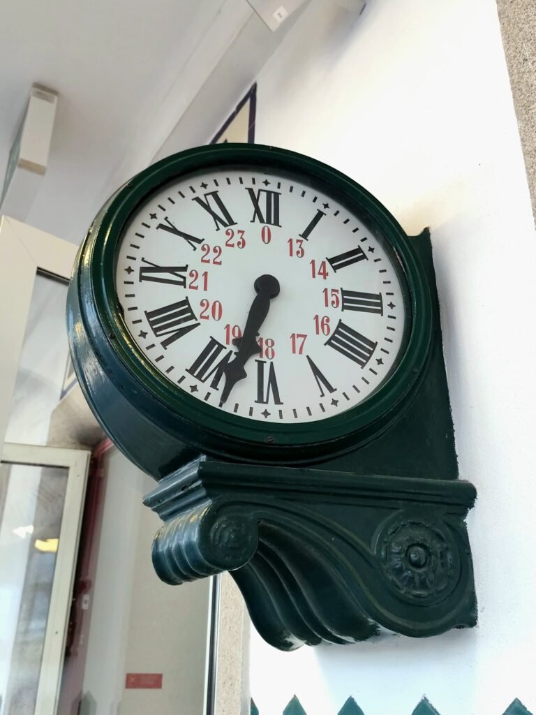 Relógio principal da estação de Évora com numeração romana, elemento clássico do ambiente ferroviário.