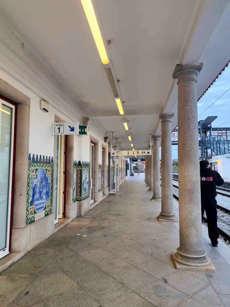 Plataforma marcada pelas colunas de granito e pelos painéis de azulejos decorativos do edifício histórico.