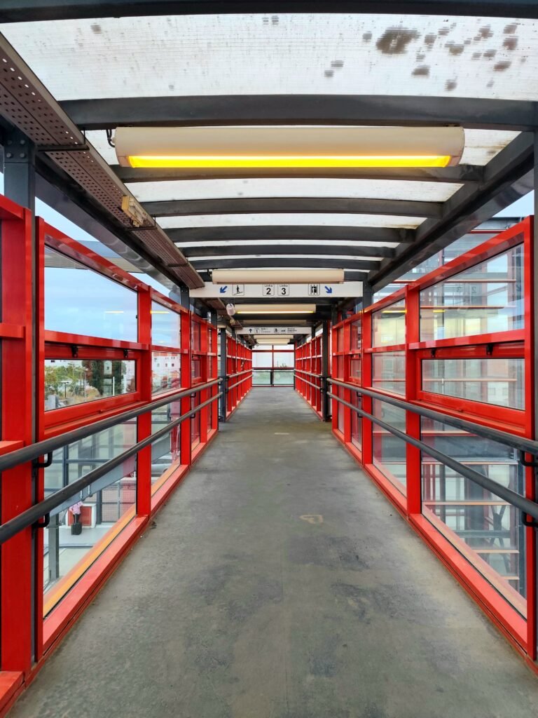 Passagem superior pedonal da estação de Évora, que liga as plataformas através de uma estrutura metálica envidraçada.