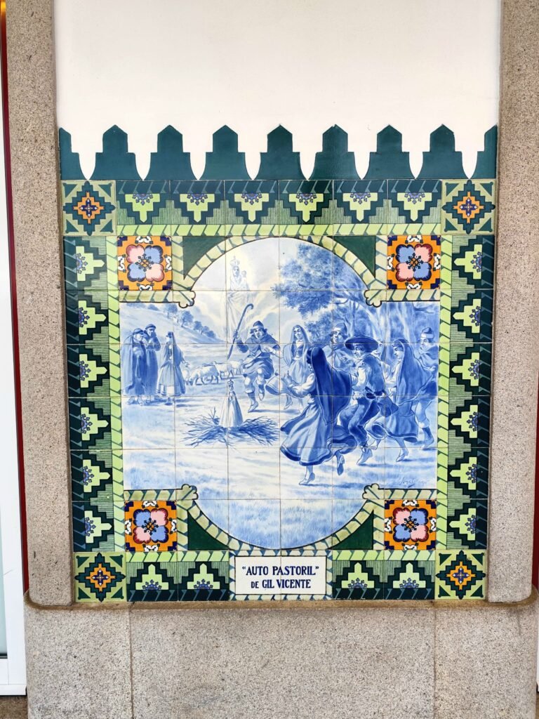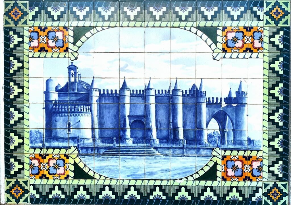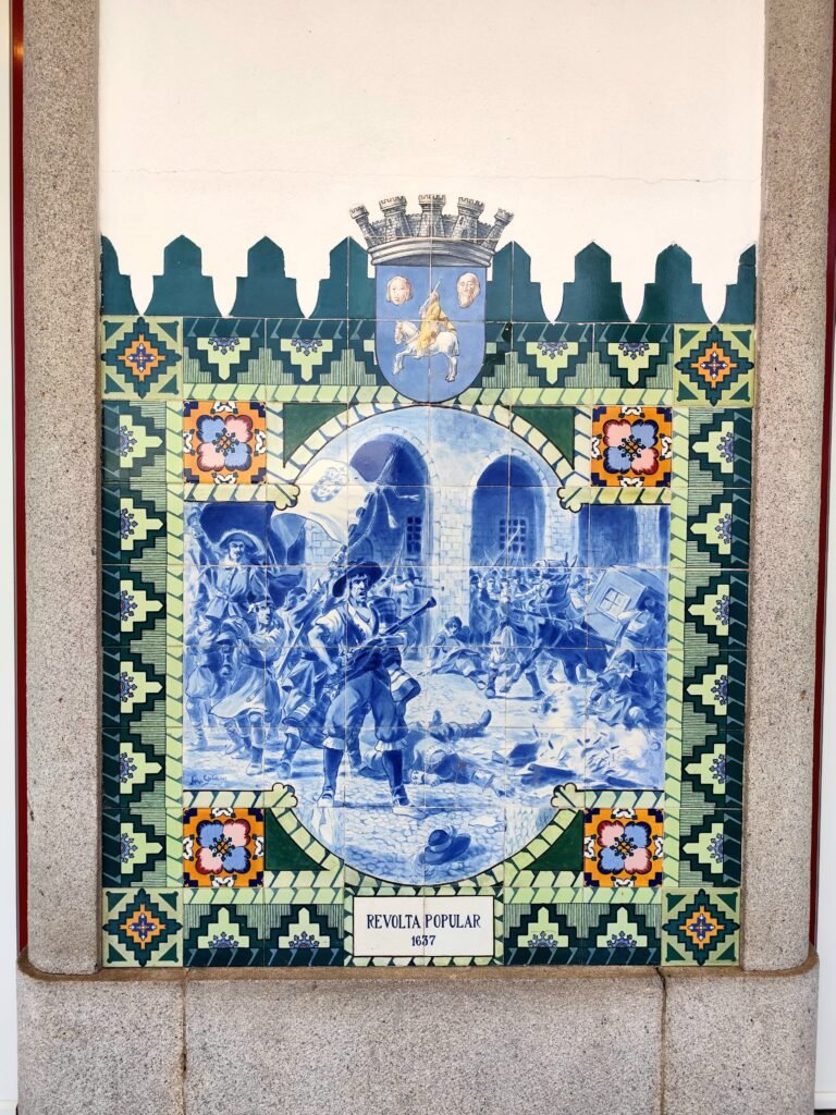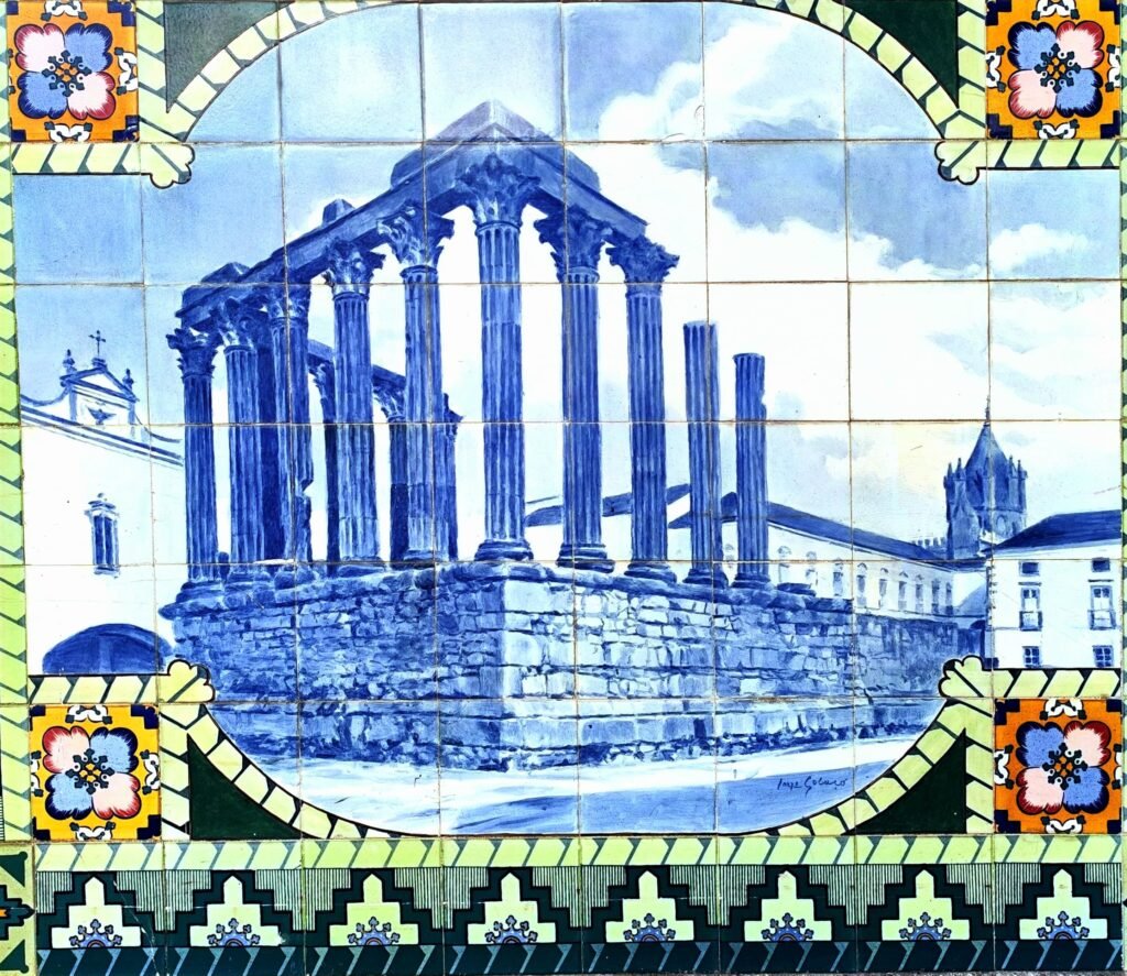Conjunto de painéis de azulejos da estação de Évora, representando episódios históricos e monumentos emblemáticos da cidade, integrados na decoração do edifício ferroviário.