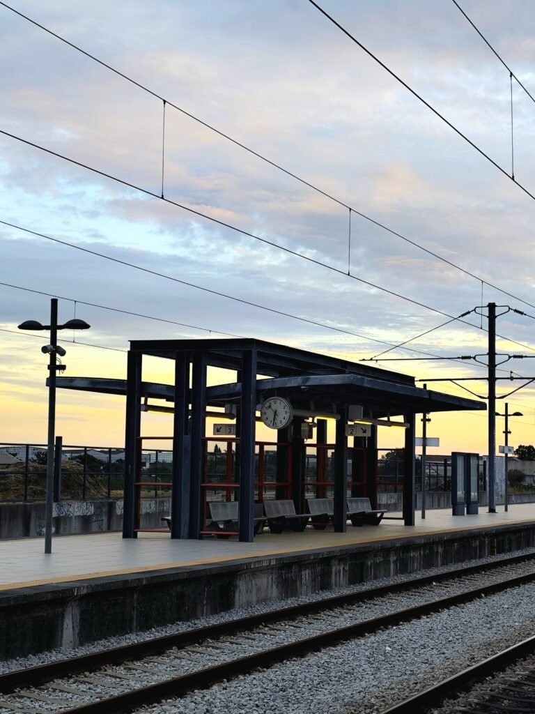 Plataforma da estação de Évora ao final da tarde, com abrigo de passageiros e relógio ferroviário tradicional.
