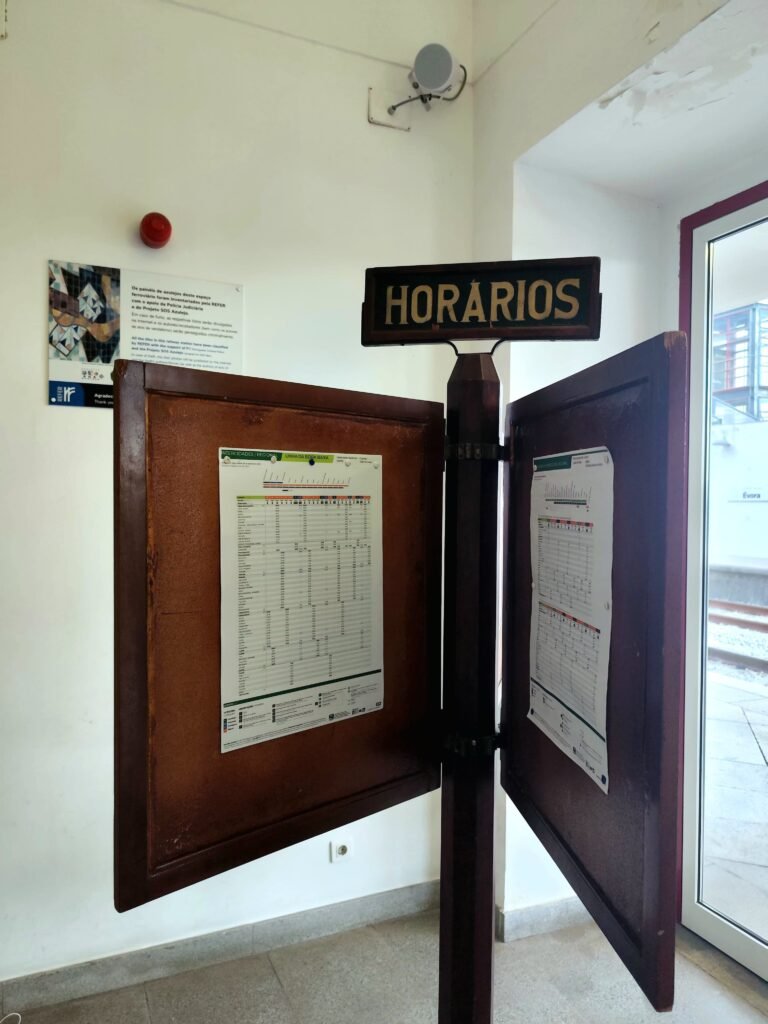 Estrutura tradicional de exposição dos horários ferroviários da estação de Évora.