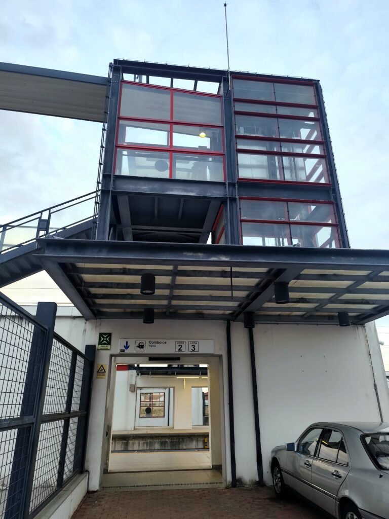 Torre de acesso à passagem superior pedonal da estação de Évora, que permite a ligação segura entre as plataformas.