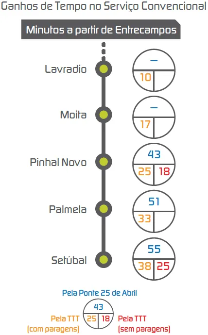 Ganhos de tempo estimados com a Terceira Travessia do Tejo, colocando o Lavradio (Barreiro) a cerca de 10 minutos de Entrecampos (Lisboa).