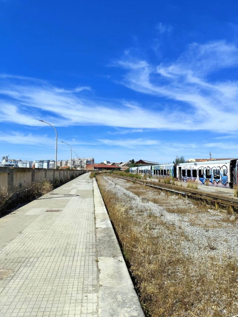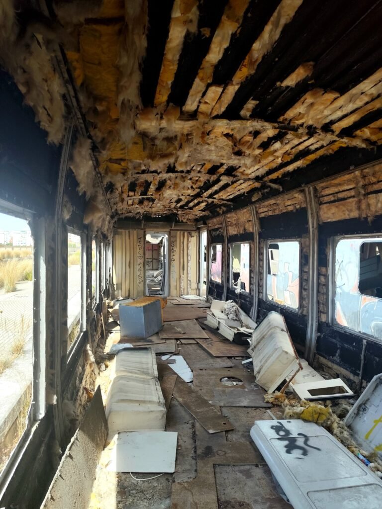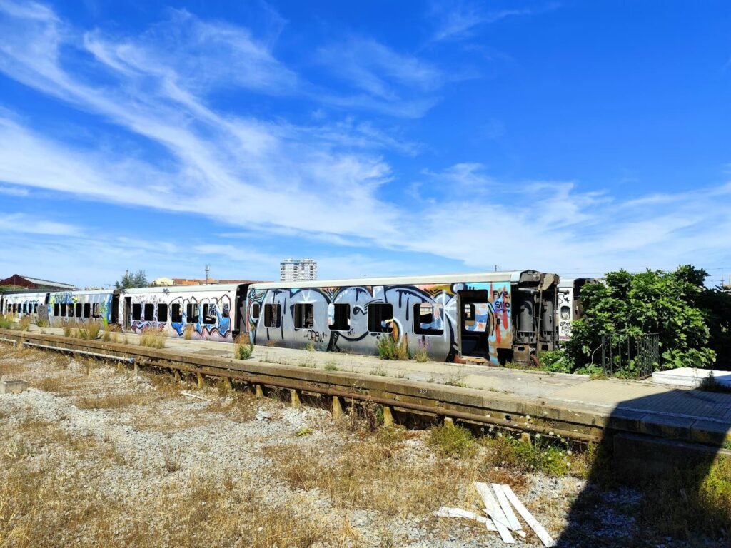 Material circulante abandonado nas antigas vias da estação, um vestígio silencioso de um complexo ferroviário hoje desativado.