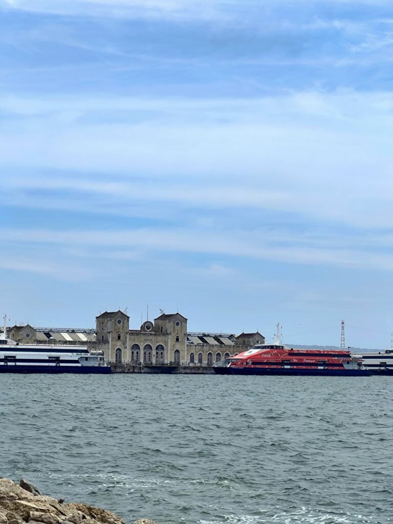 Vista sobre o Tejo, com o antigo complexo ferroviário do Barreiro ao fundo e as ligações fluviais em pleno funcionamento.