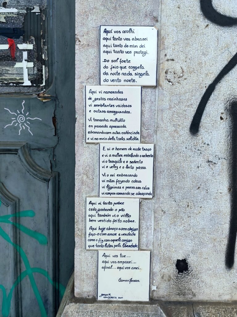Painéis poéticos nas paredes da antiga estação, palavras que hoje ocupam o lugar do movimento e dão voz ao silêncio do edifício.