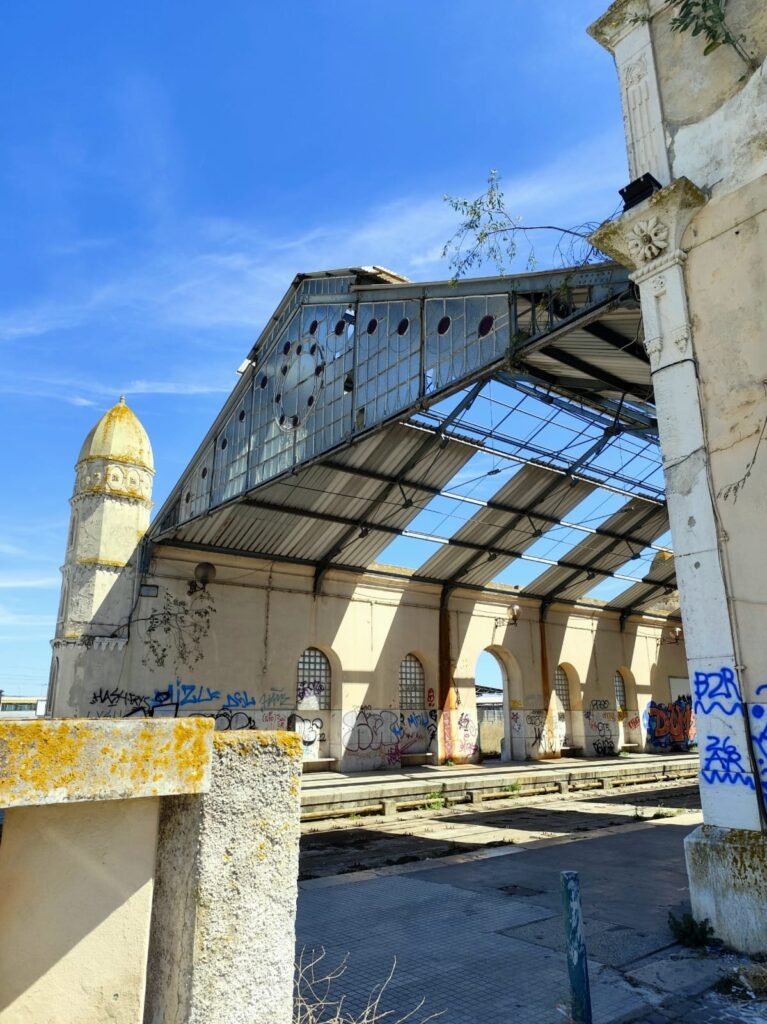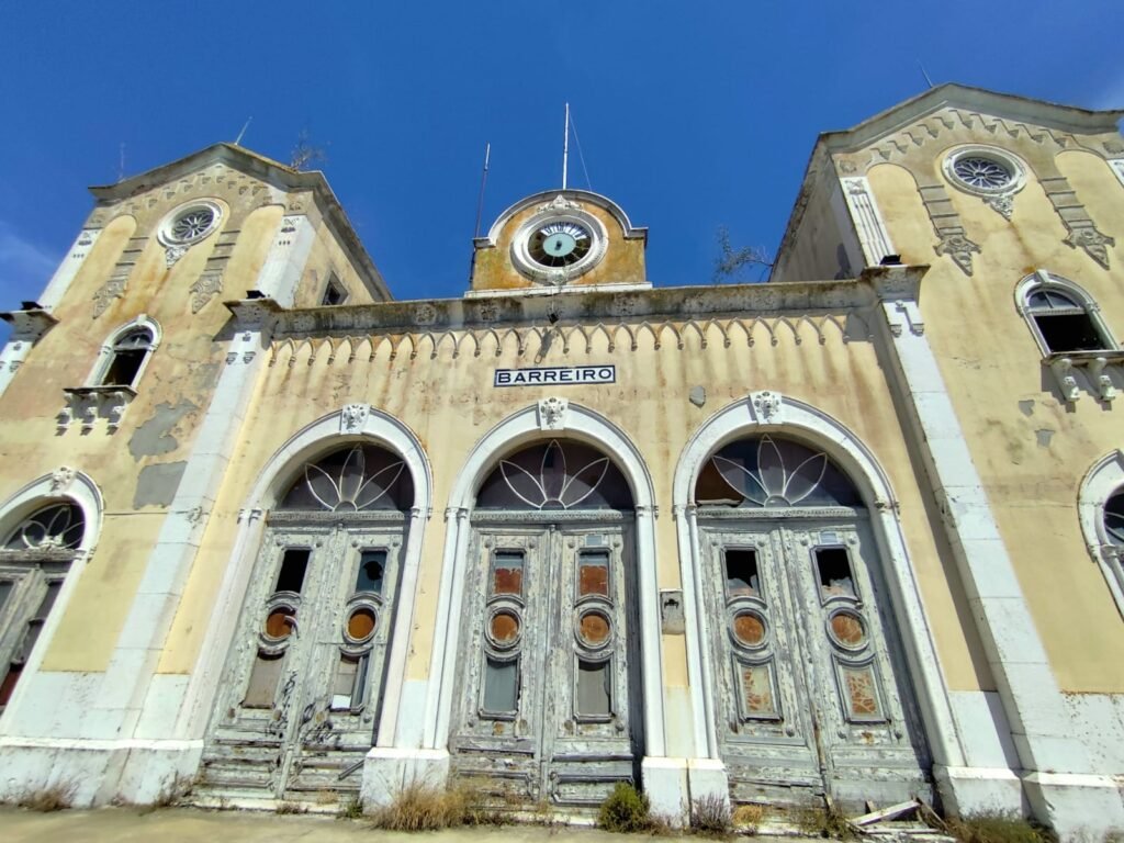 Fachada principal da antiga estação Ferro Fluvial Sul e Sueste, marcada pela arquitetura neo-manuelina e pelo abandono prolongado.