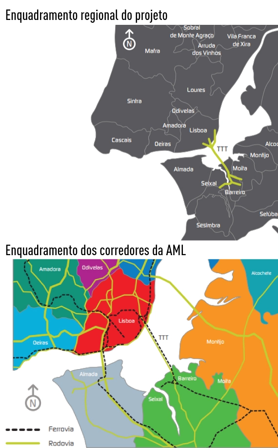 Enquadramento regional da Terceira Travessia do Tejo, reforçando o papel estratégico do Barreiro na rede ferroviária e metropolitana.